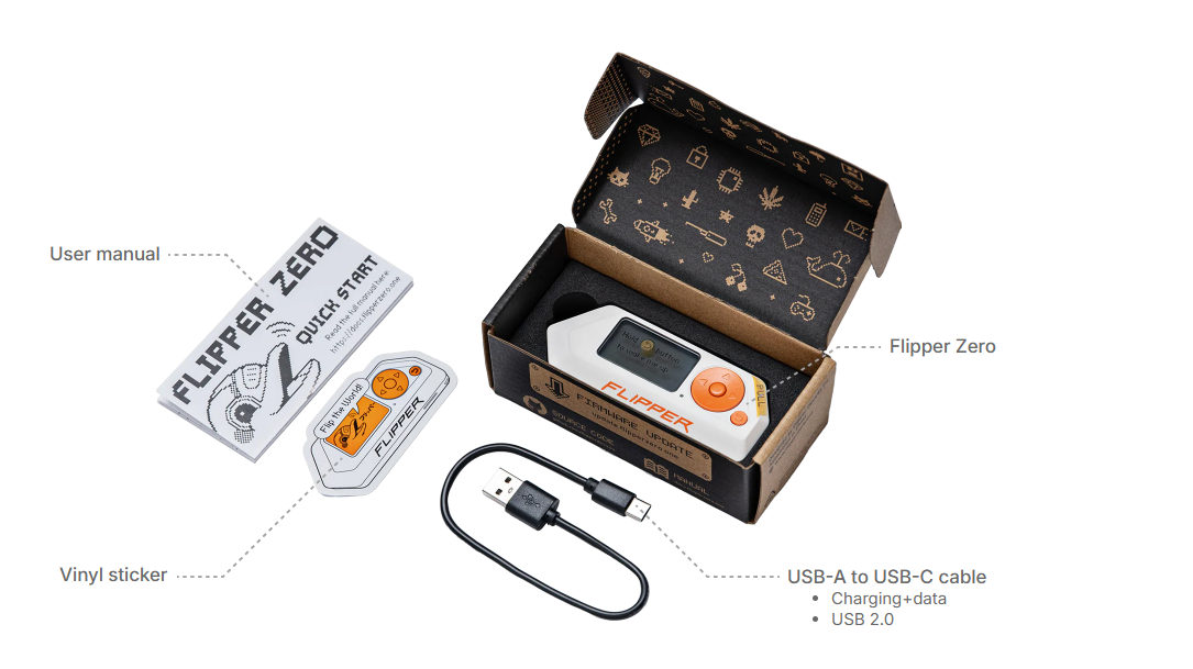 • USB-A to USB-C cable, perfect for charging your Flipper and exchanging data by connecting it to your laptop or home computer