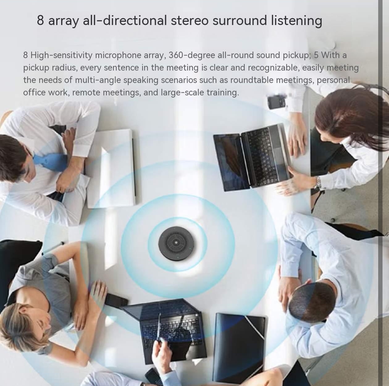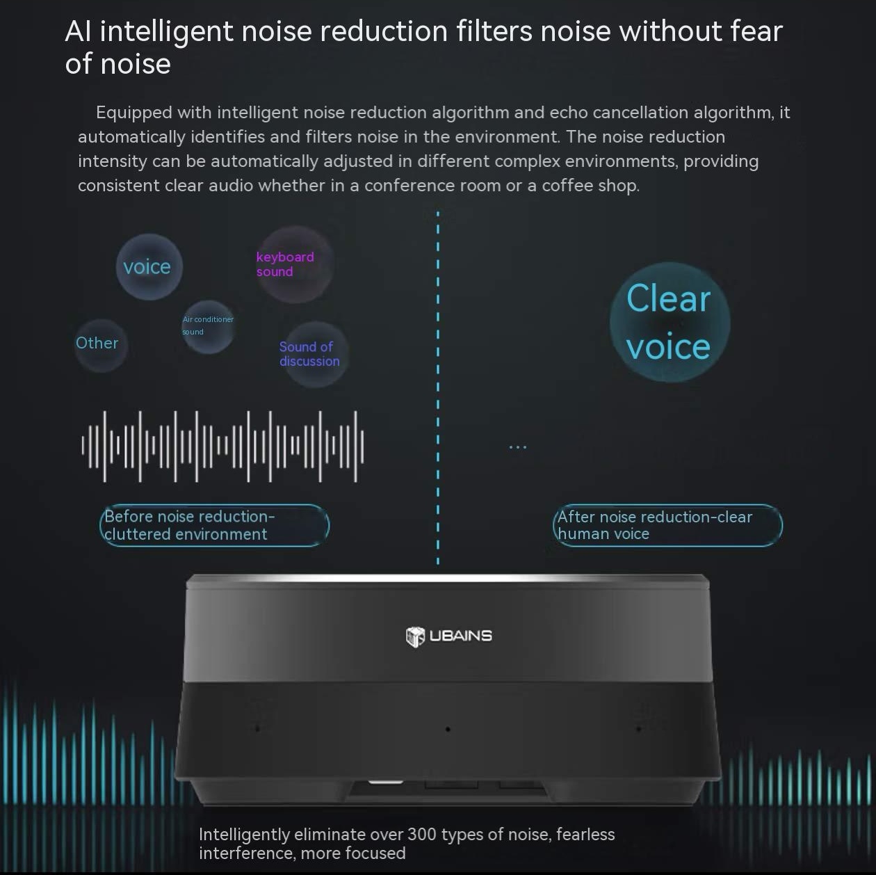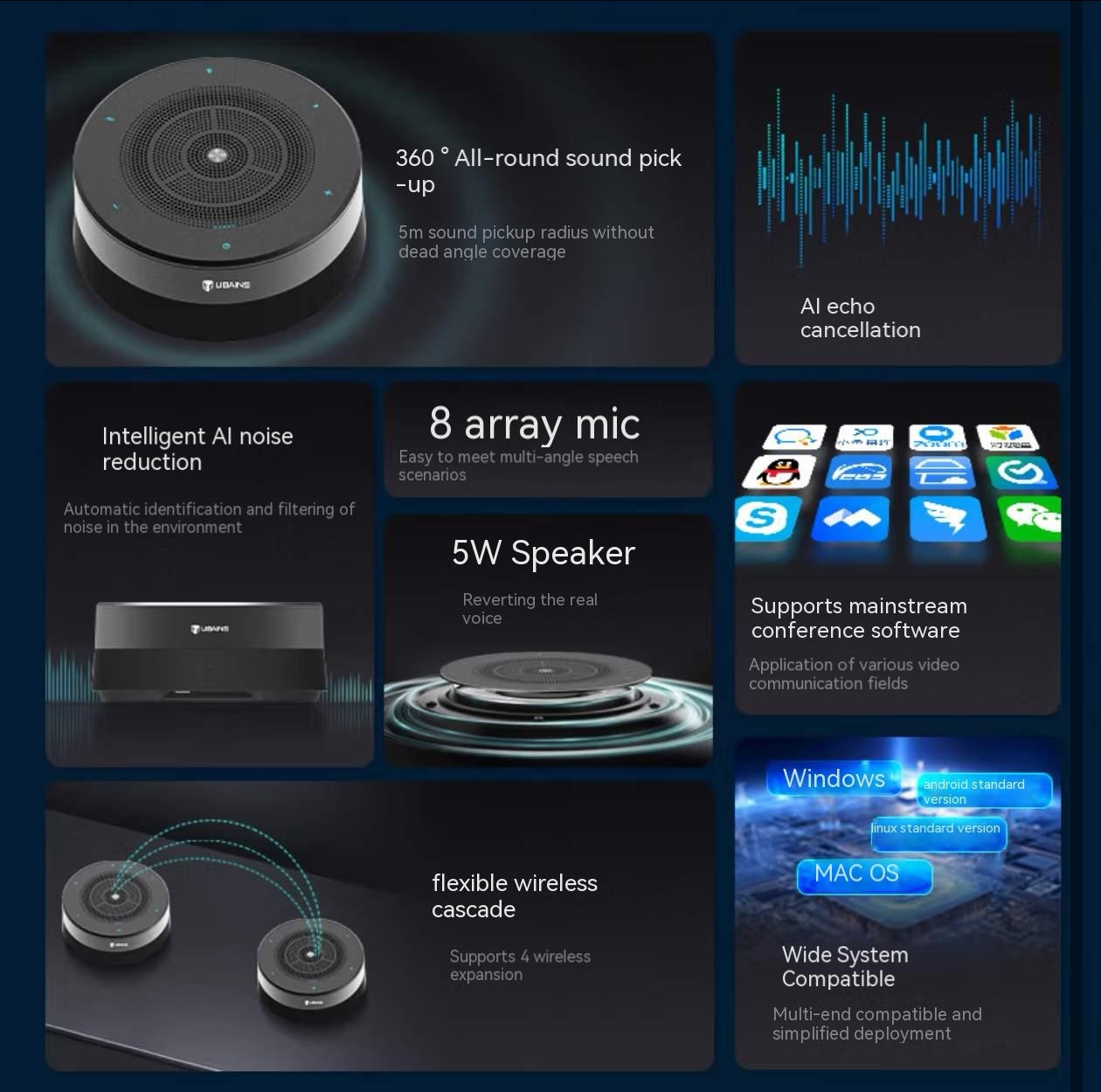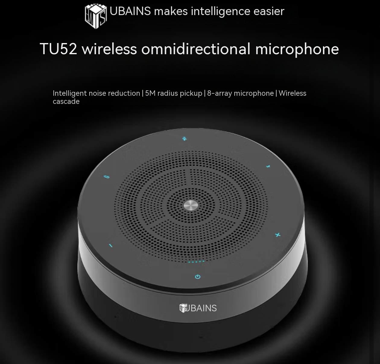 UBAINS. Long-distance pickup microphone. Heavenly AI intelligent noise reduction omnidirectional microphone. Conference speaker. Video conference room solution. Microphone and speaker desktop speaker. Integrated unit. TU52 – Intelligent noise reduction omnidirectional microphone.